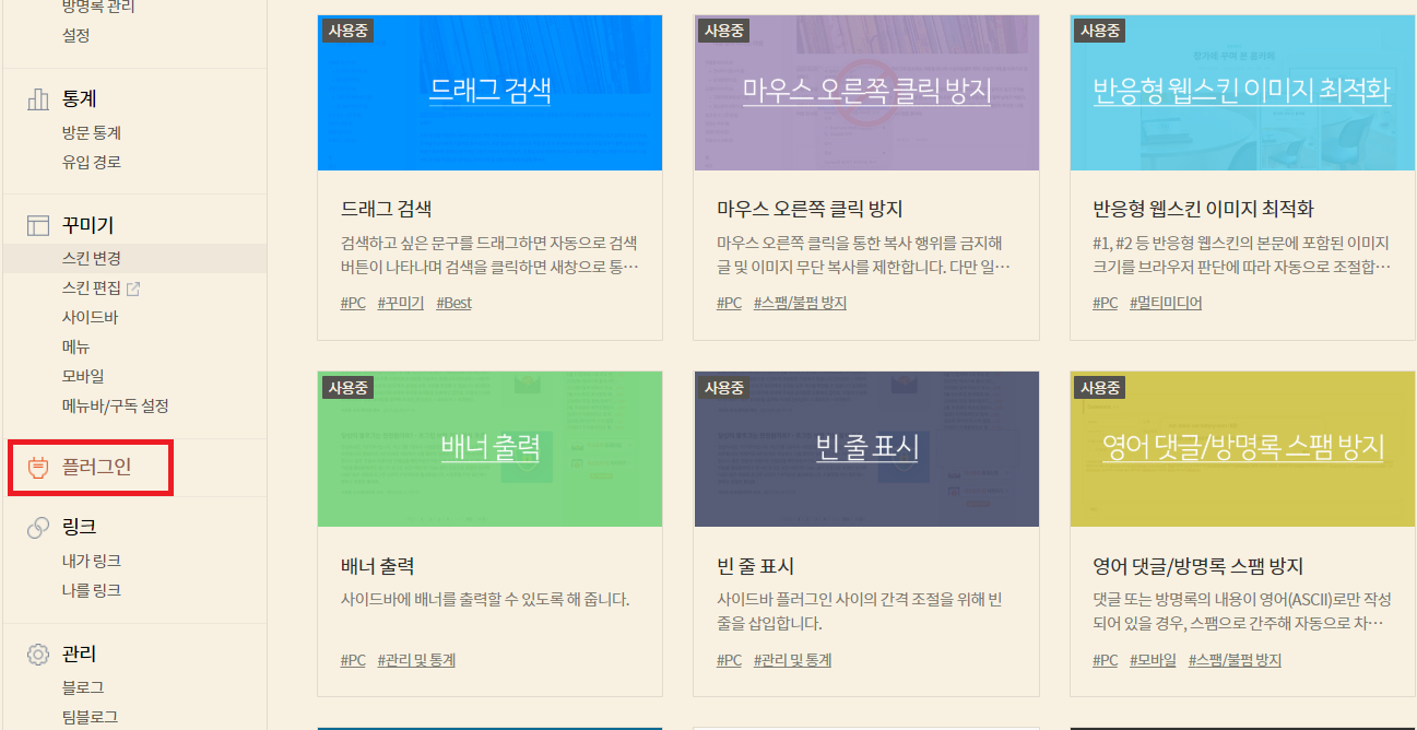 ▶ 블로그 관리 → 플러그인 탭을 클릭합니다.