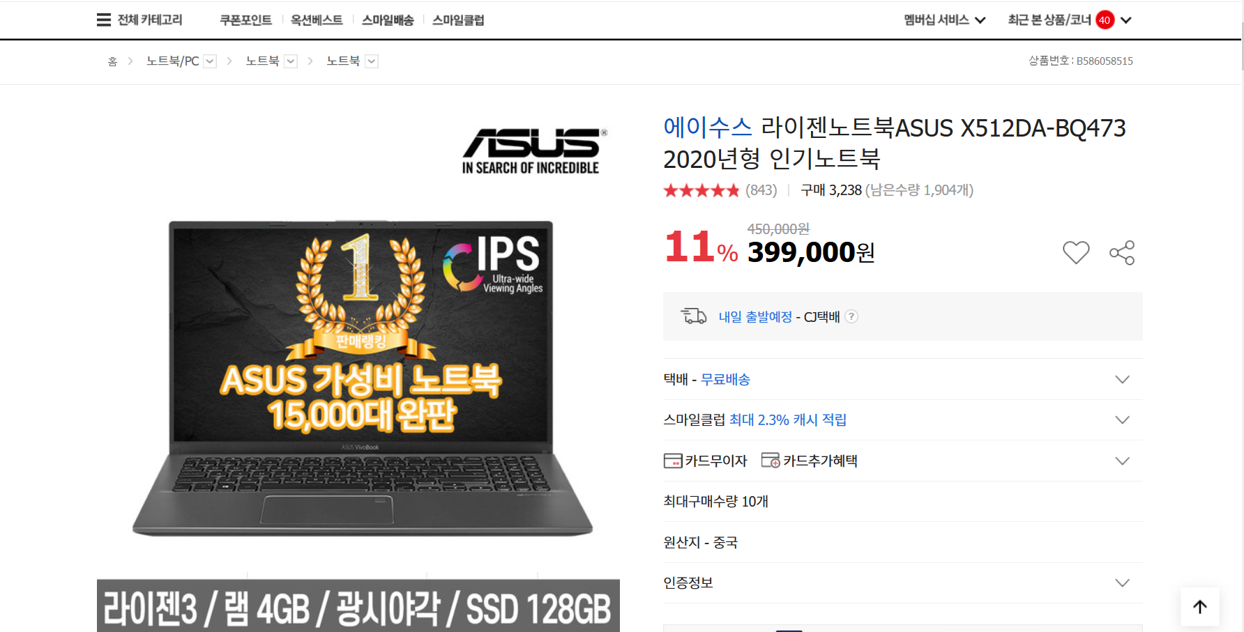 프로세서로 AMD의 피카소 라인업 APU 라이젠3 3200U에 램 4기가, SSD 128G를 달고 나온 이 녀석을 멤버십 쿠폰이나 신용카드 할인 이것저것을 받았더니 33만원(!)이라는 싼 가격에 구매했다. 물론 프리도스라 윈도우 안깔려있는거 ㅋㅋ 제품구입후 USB로 알아서 윈도우 깔면 된다. 귀찮긴 하지만 가격이 너무 매력적이라서 돈 없는 대학생들에게 추천할만한 노트북인 듯. (혹시 구입할 생각 있는 분들은 윈도우같은건 주변에 컴잘알 친구들한테 치킨 한마리 사주고 깔아달라고 하면 됨)