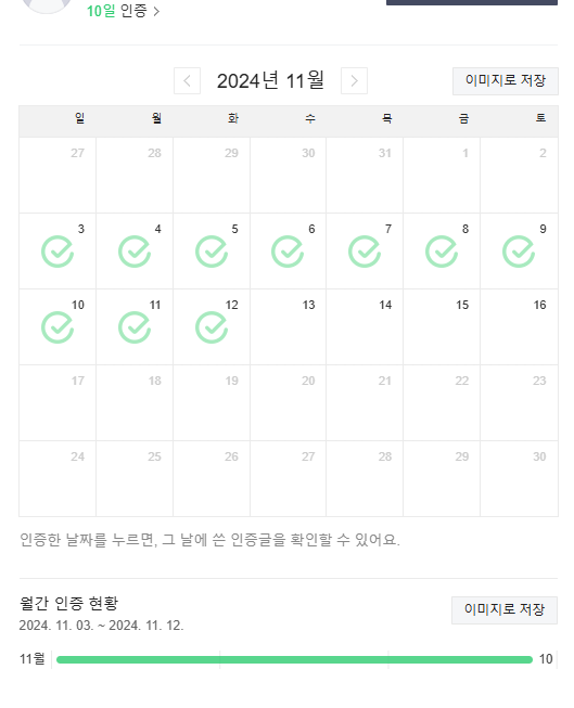 : 학업과 일을 병행하는 와중에 참여하는 챌린지였다. 너무 큰 목표에 도전하면 우선순위가 바뀌거나 지칠 수도 있었다. 그래서 중도포기하지 않고 하루에 단 10분이라도 강의를 듣고 코딩해 보는 게 목표였다. 챌린지 기간 30일 동안 단 하루도 빠짐없이 참여해서 100% 참여 목표를 달성했다.
